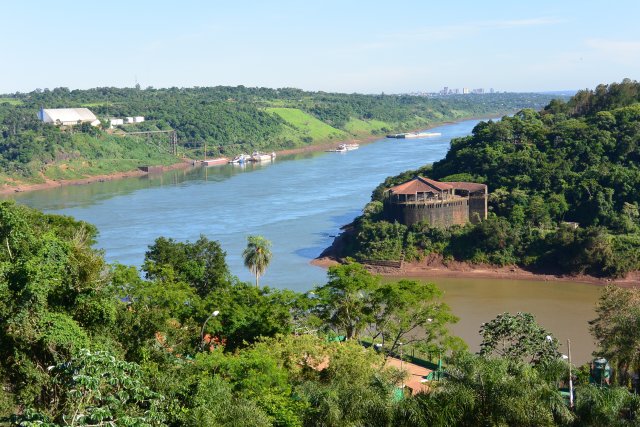 Вдали видны высотки приграничного парагвайского города Сюидад - дель - Эсте. Бразилия - справа. Граница между Бразилией и Аргентиной - по реке Игуасу. Около 20 тыс. лет назад водопады Игуасу были именно здесь, у впадения реки Игуасу в реку Парану. Затем они "ушли", отодвинулись почти на 30 км за 20 тыс. лет.