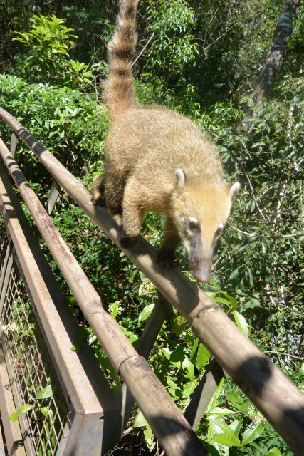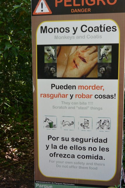 Вот такие предупреждающие щиты в этом парке повсюду. Но коати (опоссумы), говорят, не так страшны, просто трогать их не надо. Они повсюду, как коты с задранными кверху длинными хвостами бродят там.