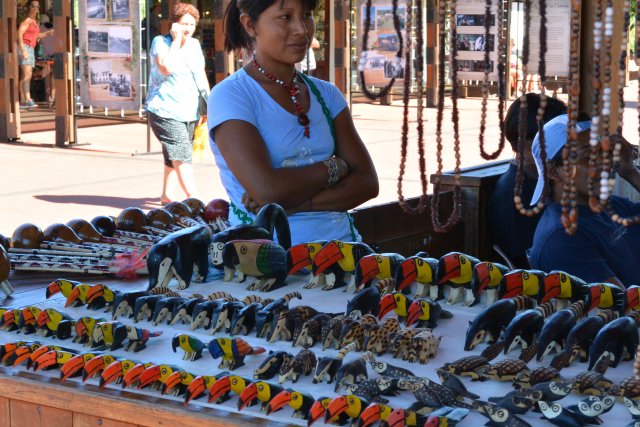 Представительница племени гуарани за продажей сувениров. Туканы, попугаи, тапиры, коати-опоссумы из дерева.